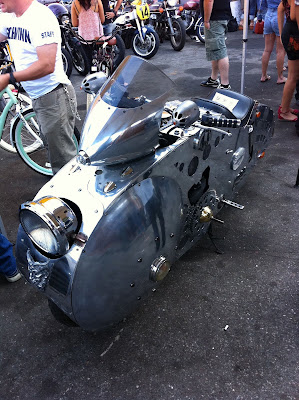 Since it was sunday we couldn't find anyone to swap out my rear tire. Austin ended up convincing this guy from Atlantis motorcycle shop to let us use his tire irons so i swapped it the old way in a parking lot. Atlantis was having a party and this wild steam punk creation was in the lot.